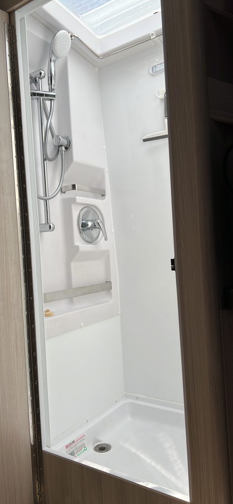 ♦ The shower stall is tight but very workable. Open the door and leave it open!