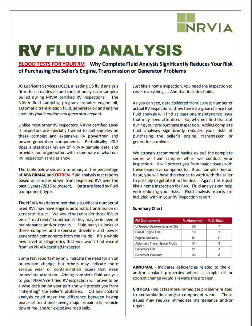 When you choose a fluid analysis, you are protecting your investment by finding out the true condition of your new-to-you RV. Results of the analysis are emailed directly to you after the lab completes its test.